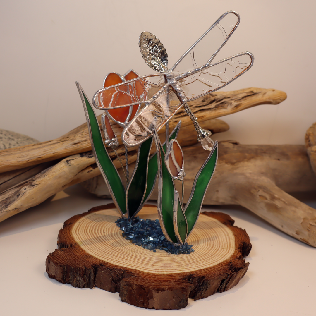 Medium: Stained Glass flower(s) and dragonfly with glass beads on a wood round