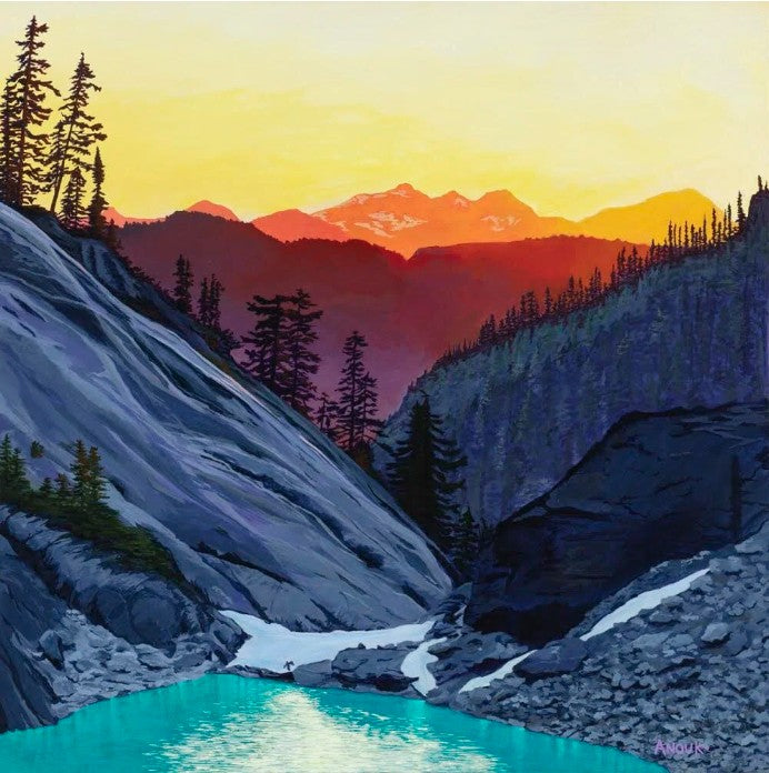 After being accepted into the interior design program in Alberta a few years later, I switched to the outdoor adventure program, which really felt like home. That's when my adventurous side took hold. I learned a lot in those two years, about whitewater canoeing, backpacking and skiing in the mountains, dogsledding and the business side to tourism. It is my love of the outdoors that works its way into my art. I mainly paint mountains, trails, oceans and outdoor activities as my theme.